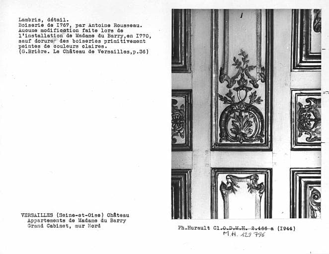 Décor des appartements de Madame du Barry, lambris du grand cabinet, détail à gauche de la cheminée, mur nord