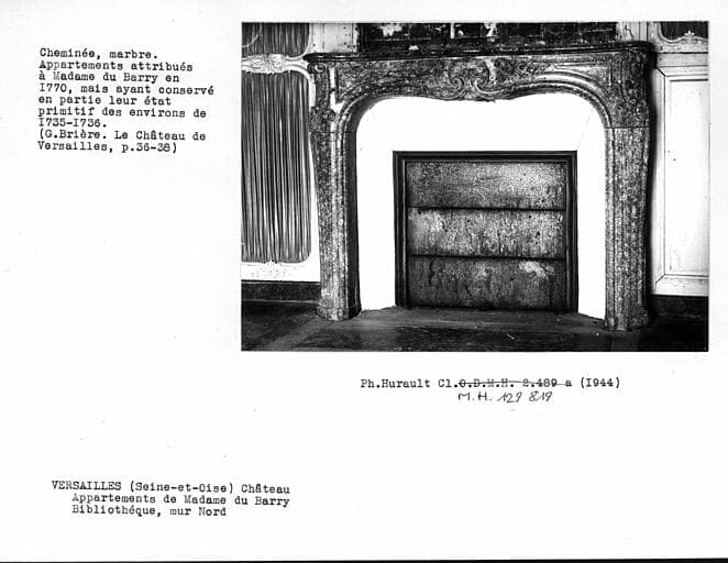 Décor de la bibliothèque de Madame du Barry, cheminée en marbre du mur nord