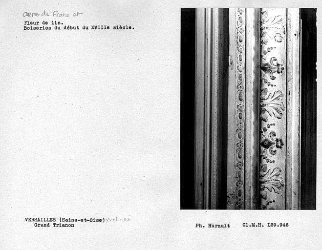 Boiseries d'encadrement de porte, ornées de fleurs de lys, derrière la pièce d'angle