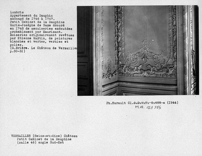 Décor du Petit cabinet de la Dauphine (salle 46), lambris, détail de la partie inférieure, angle nord-est