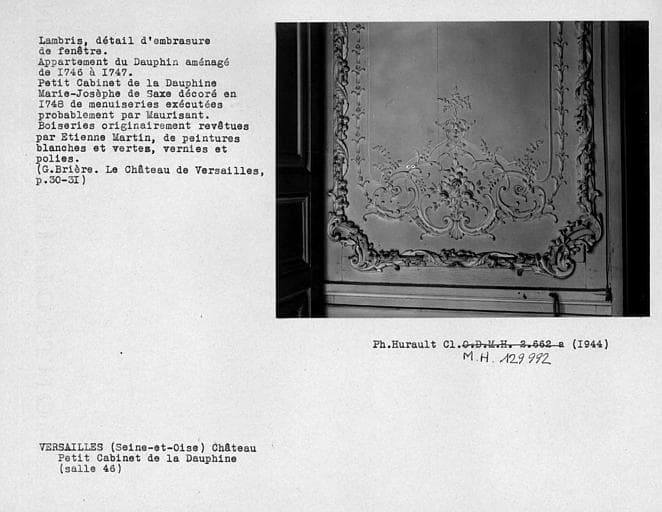 Décor du Petit cabinet de la Dauphine (salle 46), lambris, détail d'embrasure de fenêtre