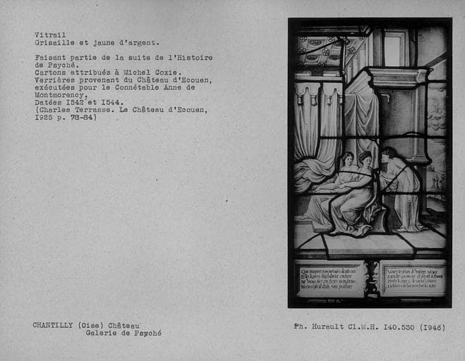 POP | Plateforme ouverte du patrimoineVitrail en grisaille et jaune d'argent dans la galerie de Psyché : Histoire de Psyché. Extrémité droite de la façade nord de l'aile ouest