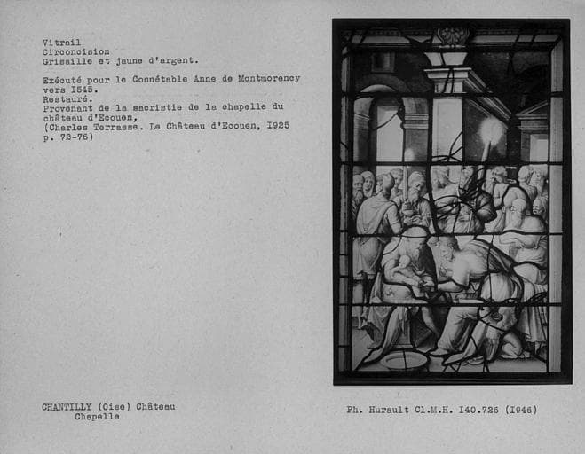Vitrail en grisaille et jaune d'argent de l'oratoire droit de la chapelle représentant la circoncision, restauré