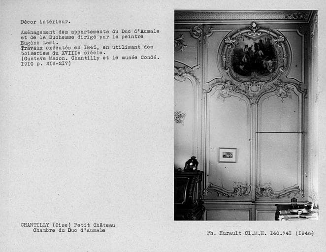 Décor intérieur des appartements du rez-de chaussée restaurés pour l'habitation du Duc d'Aumale, panneau de boiserie de la chambre du Duc