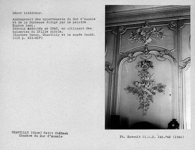 Décor intérieur des appartements du rez-de chaussée restaurés pour l'habitation du Duc d'Aumale, panneau de boiserie de la chambre du Duc