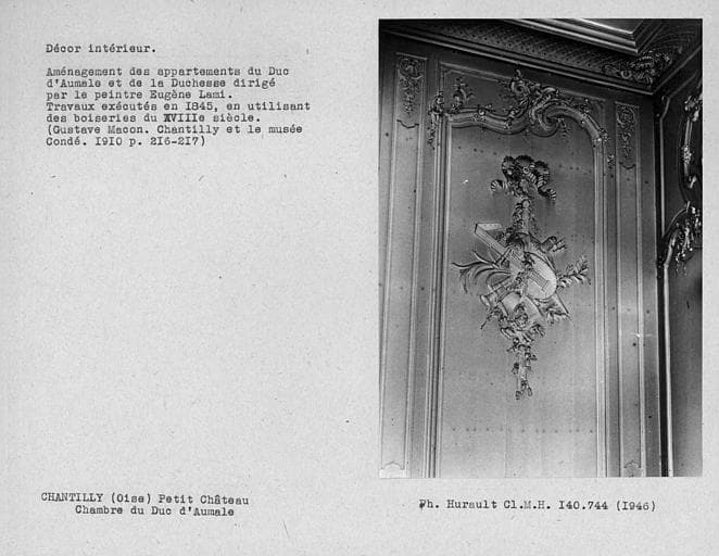 Décor intérieur des appartements du rez-de chaussée restaurés pour l'habitation du Duc d'Aumale, détail du panneau de boiserie de la chambre du Duc