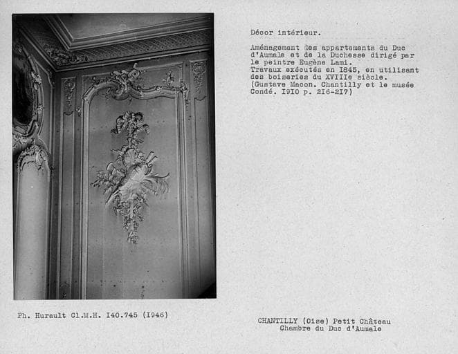 Décor intérieur des appartements du rez-de chaussée restaurés pour l'habitation du Duc d'Aumale, détail du panneau de boiserie de la chambre du Duc