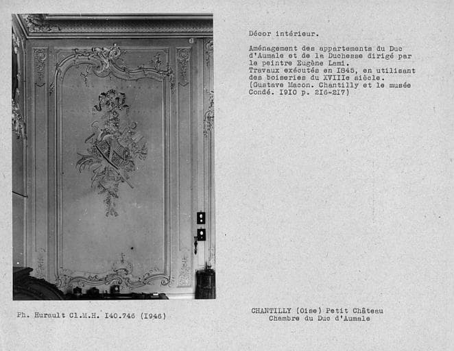 Décor intérieur des appartements du rez-de chaussée restaurés pour l'habitation du Duc d'Aumale, détail du panneau de boiserie de la chambre du Duc