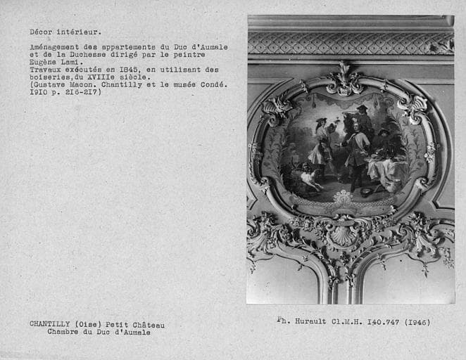 Décor intérieur des appartements du rez-de chaussée restaurés pour l'habitation du Duc d'Aumale, panneau de boiserie et médaillon peint de la chambre du Duc
