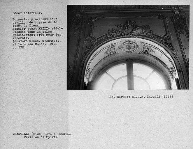 Décor du pavillon de Sylvie, détail des boiseries provenant d'un pavillon de chasse de la forêt de Dreux