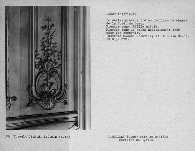 Décor du pavillon de Sylvie, détail des boiseries provenant d'un pavillon de chasse de la forêt de Dreux