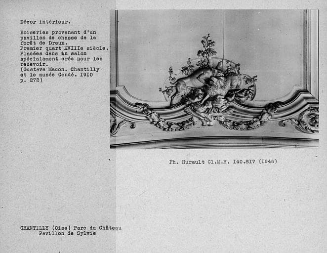 Décor du pavillon de Sylvie, détail des boiseries provenant d'un pavillon de chasse de la forêt de Dreux
