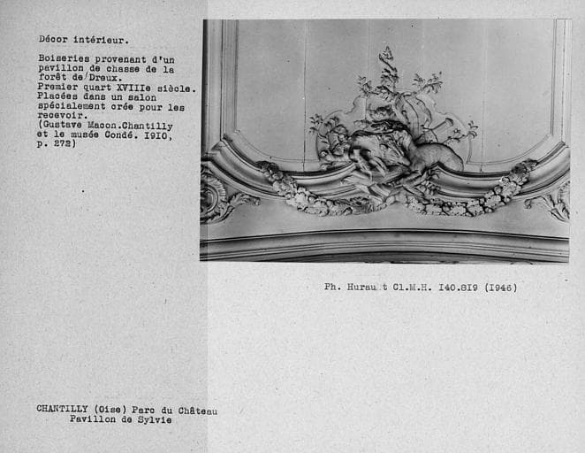 Décor du pavillon de Sylvie, détail des boiseries provenant d'un pavillon de chasse de la forêt de Dreux