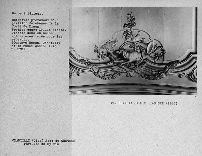 Décor du pavillon de Sylvie, détail des boiseries provenant d'un pavillon de chasse de la forêt de Dreux
