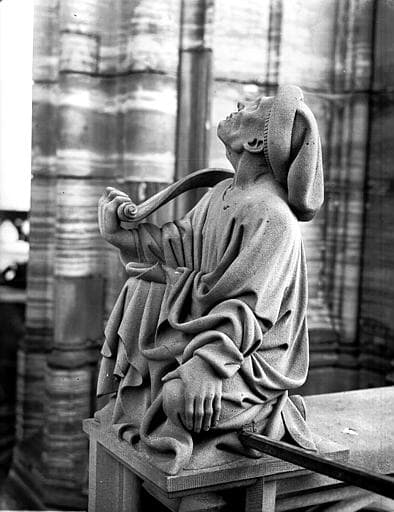 POP | Plateforme ouverte du patrimoineTour nord, première plateforme : statue d'homme agenouillé tenant phylactère