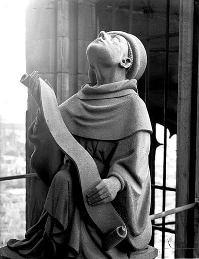 POP | Plateforme ouverte du patrimoineTour nord, première plateforme : statue d'homme agenouillé tenant phylactère