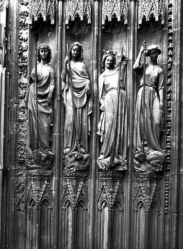 Façade ouest, portail de gauche : groupe de Vertus terrassant les Vices