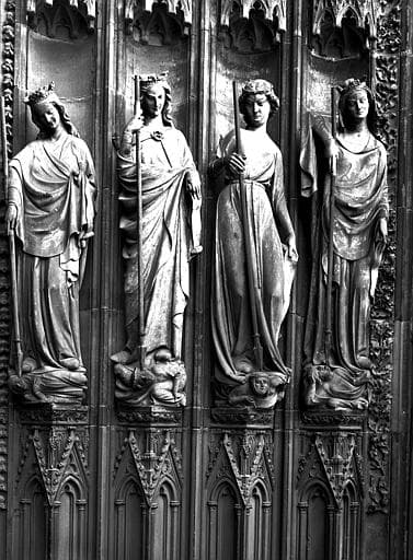 Façade ouest, portail de gauche : groupe de Vertus terrassant les Vices