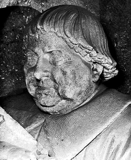Chapelle Saint-Jean-Baptiste, pierre tombale d'un chanoine, pierre sculptée, détail, tête du chanoine
