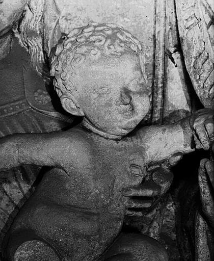POP | Plateforme ouverte du patrimoineChapelle Saint-Jean-Baptiste, pierre tombale d'un chanoine, pierre sculptée, détail, l'Enfant Jésus