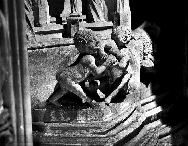 Chaire à prêcher, soubassement, génies