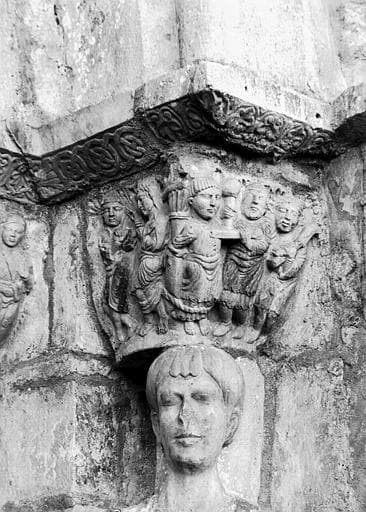 POP | Plateforme ouverte du patrimoinePortail de la façade nord. Chapiteau et statue du piédroit droit : tête de saint Pasteur et scène de son martyre