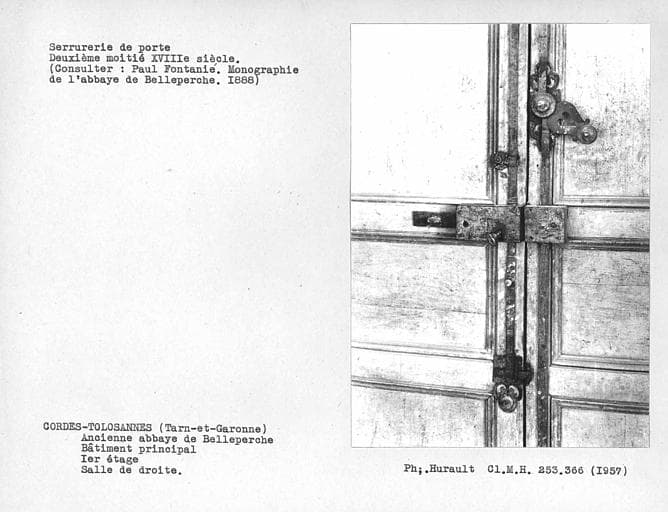 Salle ouvrant à droite sur le palier au premier étage du bâtiment central, serrurerie des vantaux de la porte