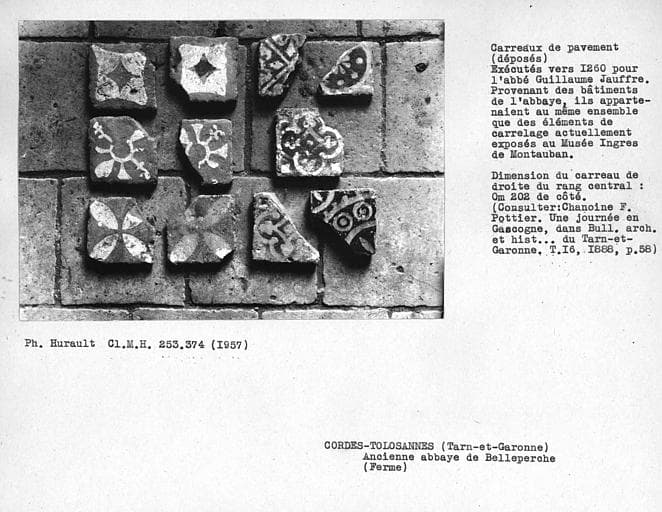 Carreaux de pavement déposés provenant de l'abbaye, de la partie ouest des bâtiments, dépendant d'une ferme