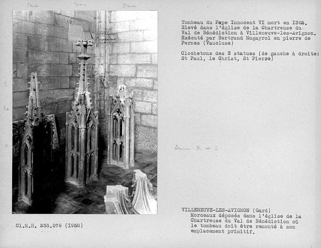 POP | Plateforme ouverte du patrimoineEglise : tombeau du Pape Innocent VI, en cours de transfert, clochetons des 3 statues, de gauche à droite : Saint-Paul, le Christ, Saint-Pierre