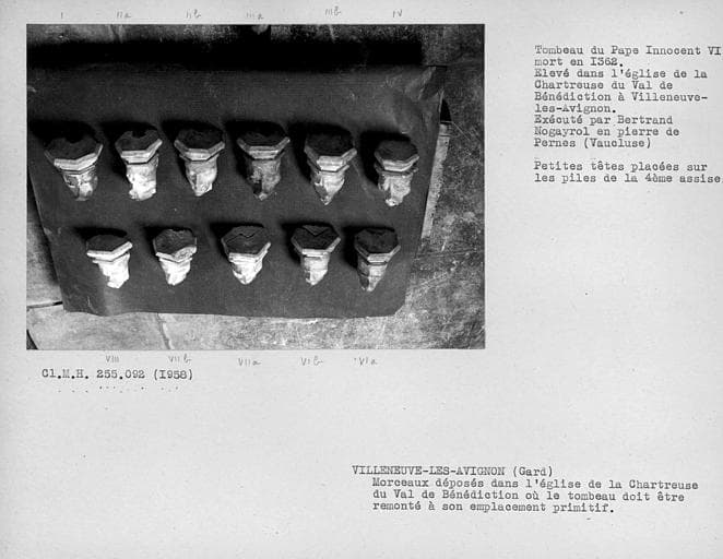 POP | Plateforme ouverte du patrimoineEglise : tombeau du Pape Innocent VI, en cours de transfert, petites têtes placées sur les piles de la quatrième assise