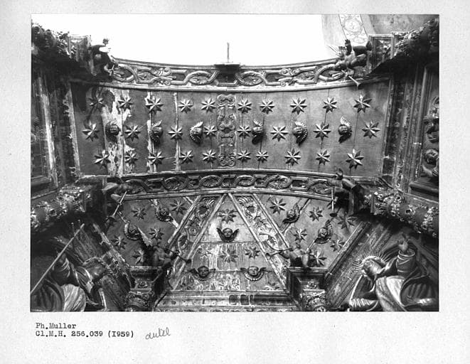 Autel. Détail des boiseries décorant l'autel de la chapelle nord de la nef, vue d'ensemble de la voûte