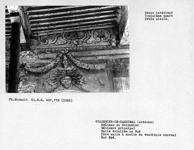 POP | Plateforme ouverte du patrimoineDécor intérieur de la première salle sur parc du rez-de-chaussée, frise au-dessus de la troisième vertu à partir de l'est : prudence, mur sud à droite du vestibule