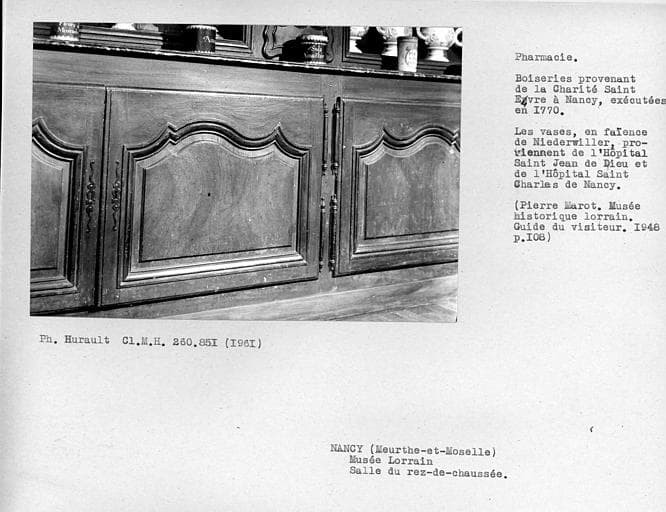 Détail de boiseries de pharmacie, vases en faïence de Niederwiller