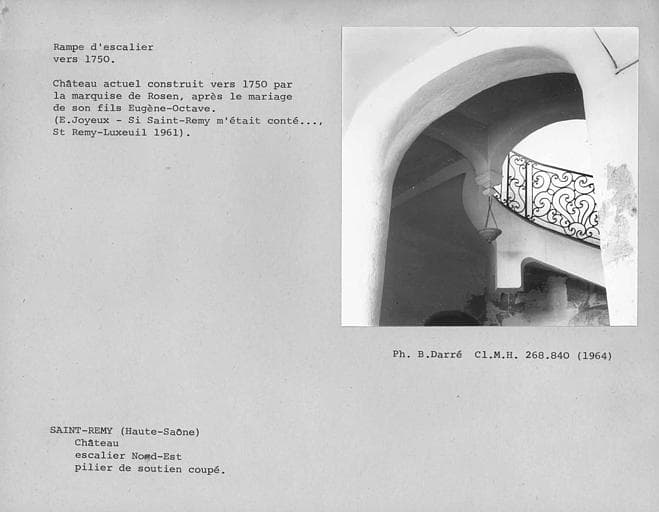 POP | Plateforme ouverte du patrimoineRampe en fer forgé de l'escalier nord-est, pilier tronqué de la partie haute de la volée