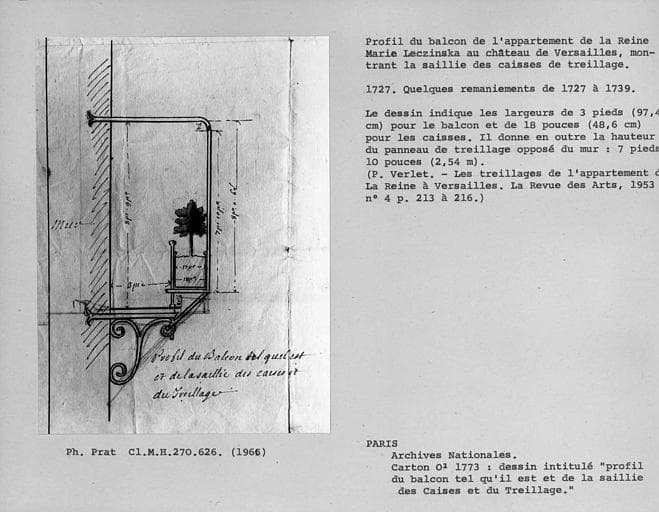 Dessin du treillage du balcon de l'appartement de la reine Marie Leczinska, de profil