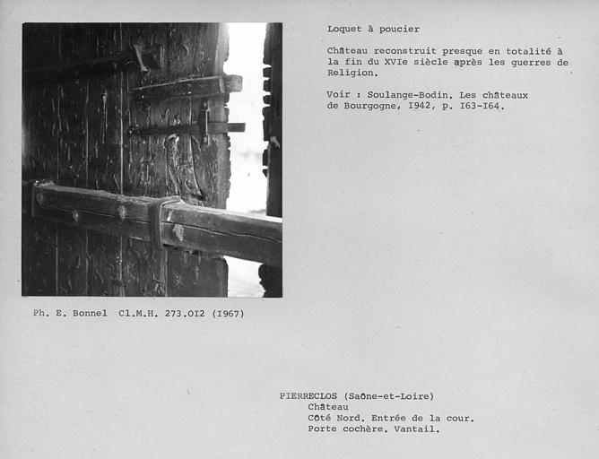Entrée de la cour intérieure au nord, loquet et barre de fermeture du vantail de la porte cochère