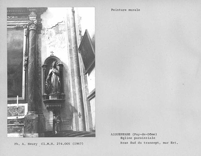 Mur est du bras sud du transept, sondage laissant apparaître un fragment de peinture murale sur la partie à droite du retable