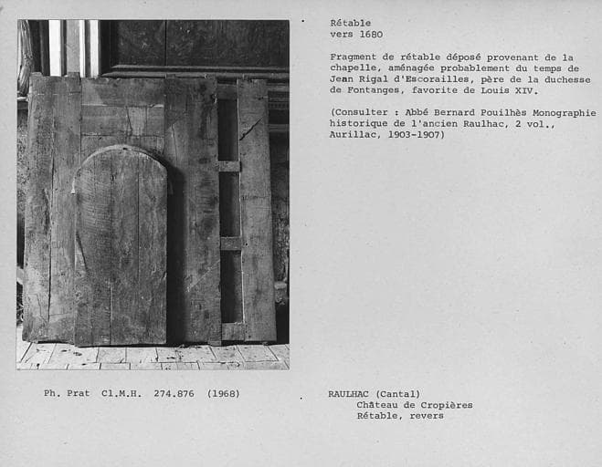 POP | Plateforme ouverte du patrimoineFragment de retable déposé provenant de l'ancienne chapelle, aménagée probablement du temps de Jean Rigal D'escorailles, père de la duchesse de Fontanges, favorite de Louis XIV