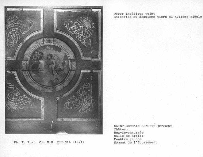 Décor de la salle de droite au rez-de-chaussée, boiseries peintes du sommet de l'ébrasement de la fenêtre gauche