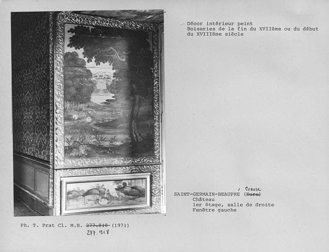 Décor de la salle de droite au premier étage, boiseries peintes de l'ébrasement gauche de la fenêtre