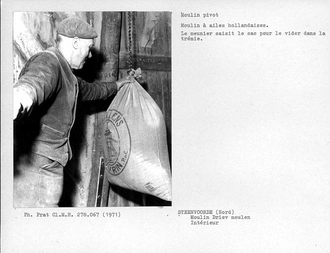 POP | Plateforme ouverte du patrimoineIntérieur du moulin, le meunier saisit le sac pour le vider dans la trémie