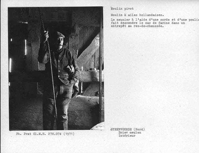 POP | Plateforme ouverte du patrimoineIntérieur du moulin, le meunier à l'aide d'une corde fait descendre le sac de farine dans un entrepôt au rez-de-chaussée
