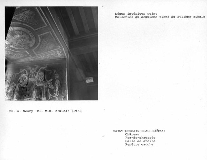 Décor de la salle de droite au rez-de-chaussée, partie haute et sommet des boiseries peintes de l'ébrasement droit de la fenêtre gauche