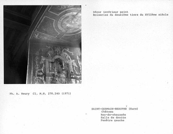Décor de la salle de droite au rez-de-chaussée, partie haute et sommet des boiseries peintes de l'ébrasement gauche de la fenêtre gauche