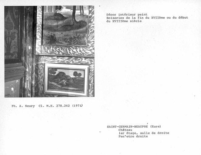 Décor de la salle de droite au rez-de-chaussée, partie basse des boiseries peintes de l'ébrasement droit de la fenêtre droite