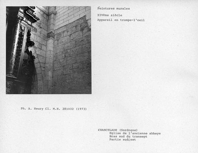 Eglise abbatiale. Angle sud-est du bras sud du transept, faux appareil peint