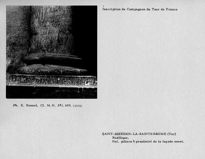 Inscription de Compagnons du Tour de France sur un piliers à proximité de la façade ouest de la nef