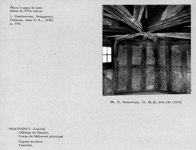 Charpente du corps de bâtiment principal. Pièce à pans de bois de la tourelle, façade arrière