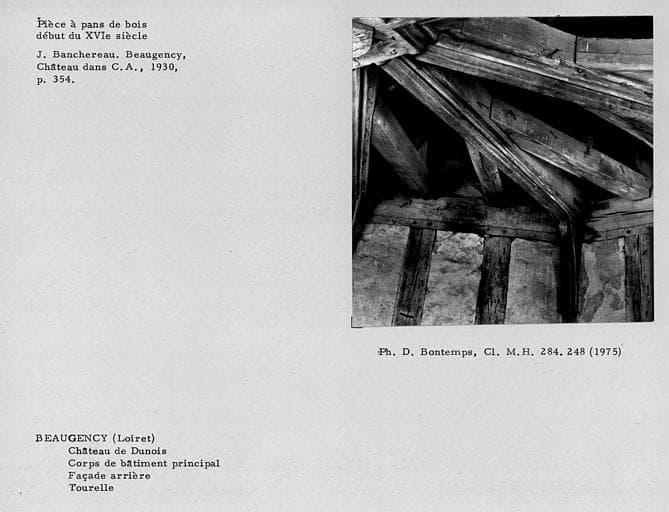 Charpente du corps de bâtiment principal. Pièce à pans de bois de la tourelle, façade arrière