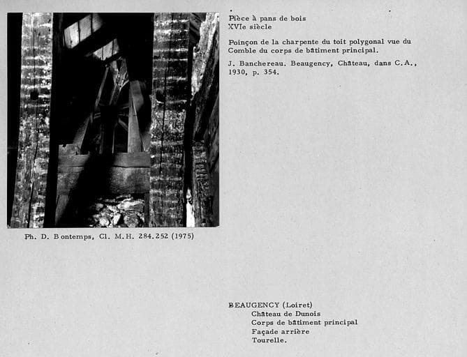 Charpente du corps de bâtiment principal. Pièce à pans de bois de la façade arrière de la tourelle. Poinçon du toit polygonal
